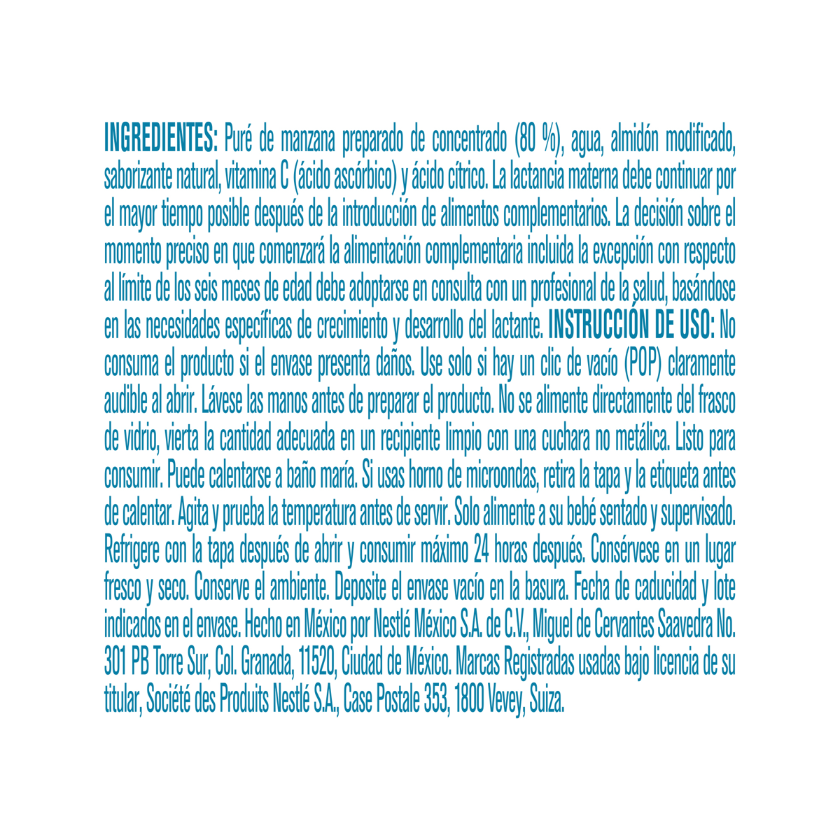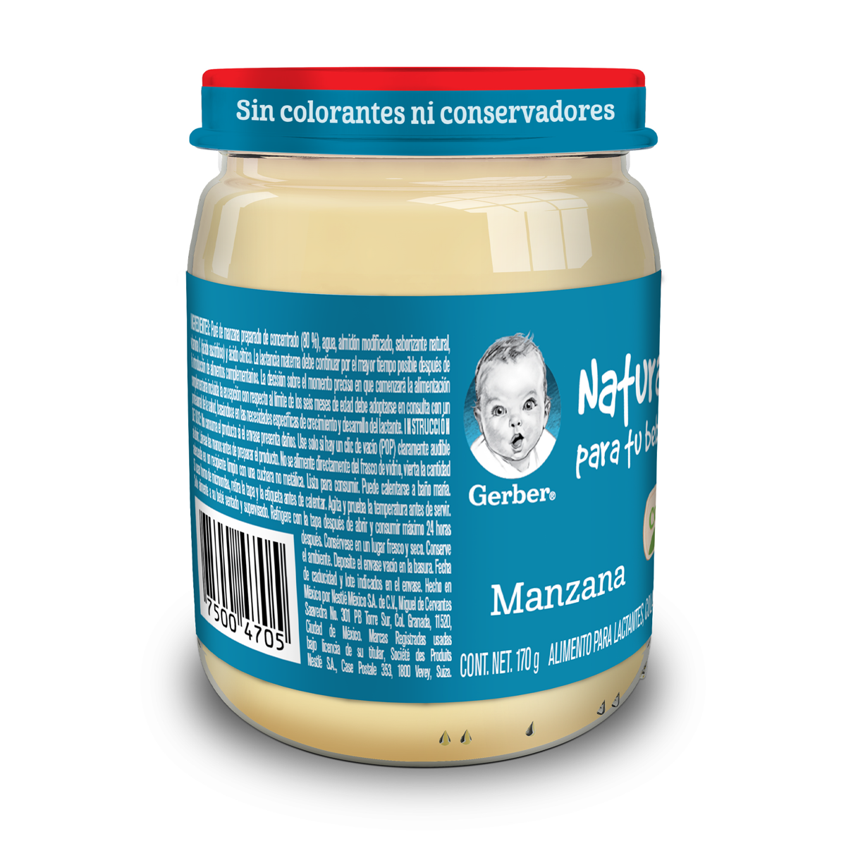 Papillas para bebé Gerber Etapa 3 de manzana (alimento para bebé de de 8 meses en adelante). Las papillas de 8 meses Gerber son la comida para bebé: -Sin saborizantes artificiales. -Sin colorantes artificiales. -Sin conservadores. -Sin azúcar añadida. -Papillas de fruta 100% natural. Ayuda a que tu bebé descubra todos los sabores de Gerber. ¿Primera comida del bebé? Dale lo mejor a tu bebé y sigue su desarrollo paso a paso. Gerber: Por tu bebé, todo.