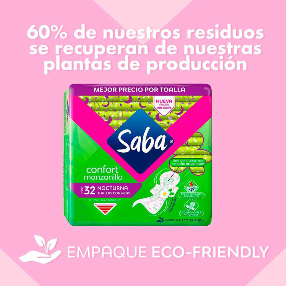 Las toallas femeninas Saba Confort Manzanilla Nocturna saben que tu zona-V es delicada y merece un cuidado natural mientras duermes. Con una toalla que te mantiene limpia y protegida duante todo el día y te hace sentir cómoda al despertar Saba, Libertad de sentirte cómoda.